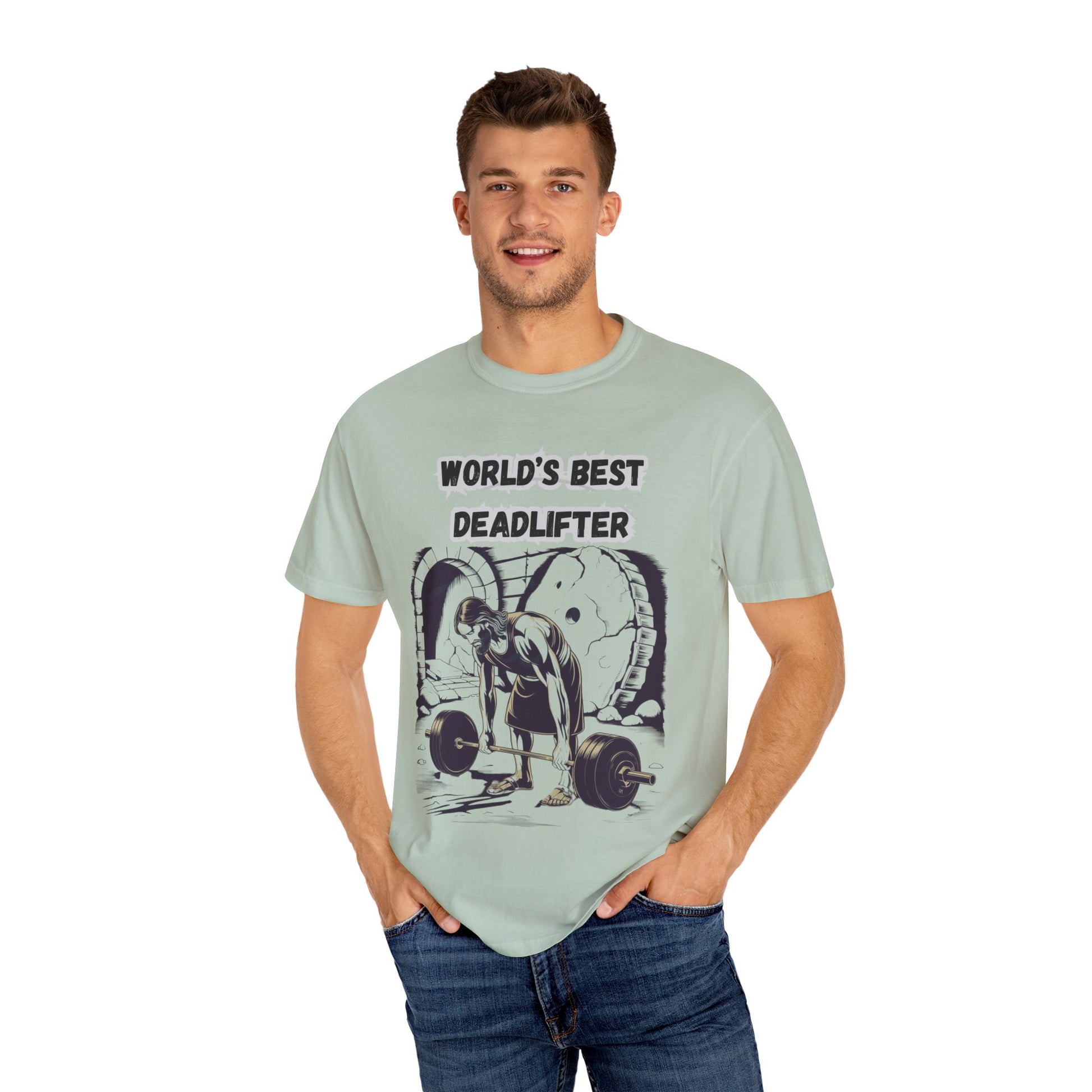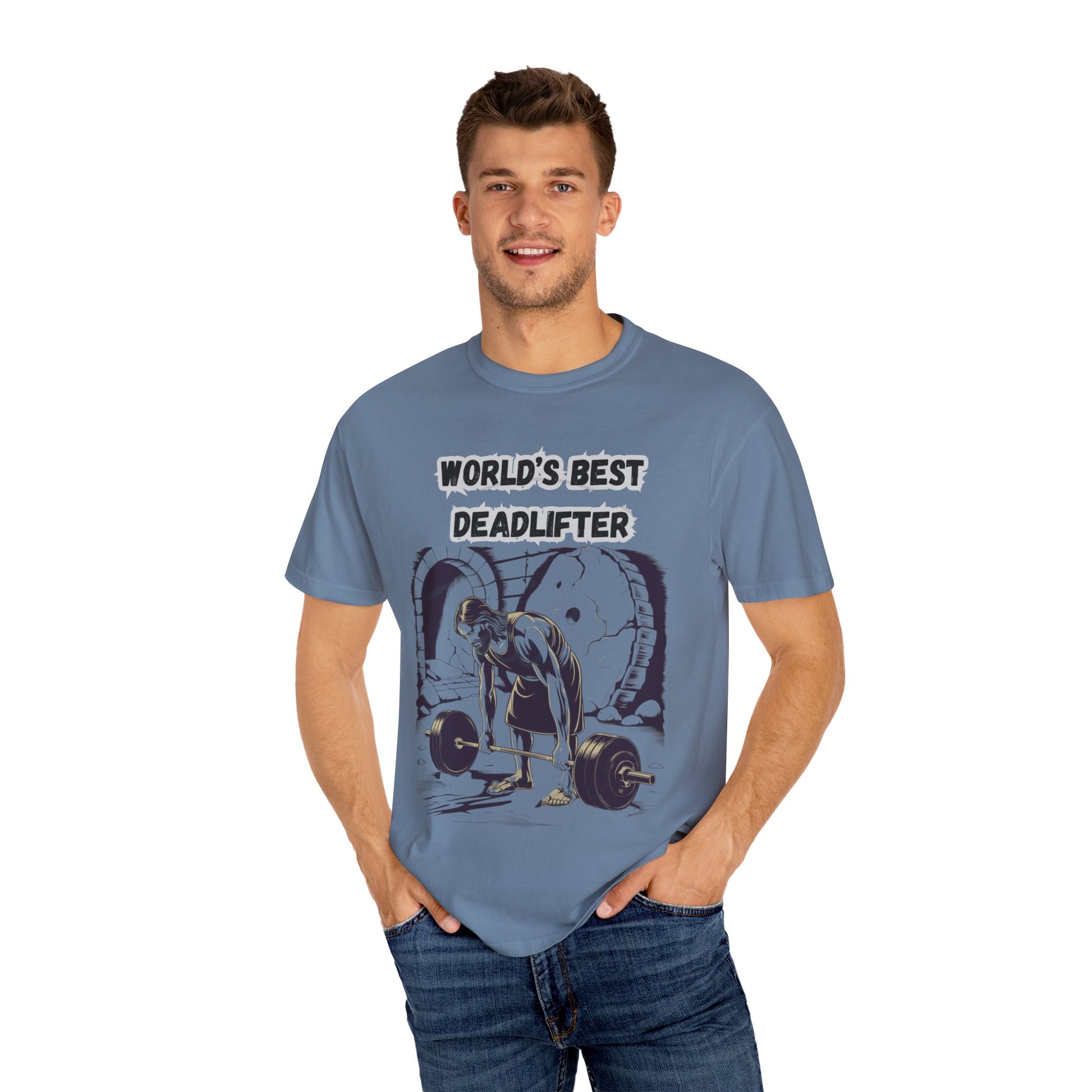 This world's Best Deadlifter design T-shirt combines faith and fitness in a humorous way, perfect for gym-goers and those who enjoy weightlifting. It is relevant for holidays and occasions like Christmas, birthdays, and gym anniversaries.